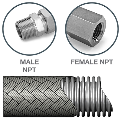 Extra Flexible St.St 316L Hose, Single St.St 316 Braid, Male NPT 3/8” x Femal NPT 3/8”
